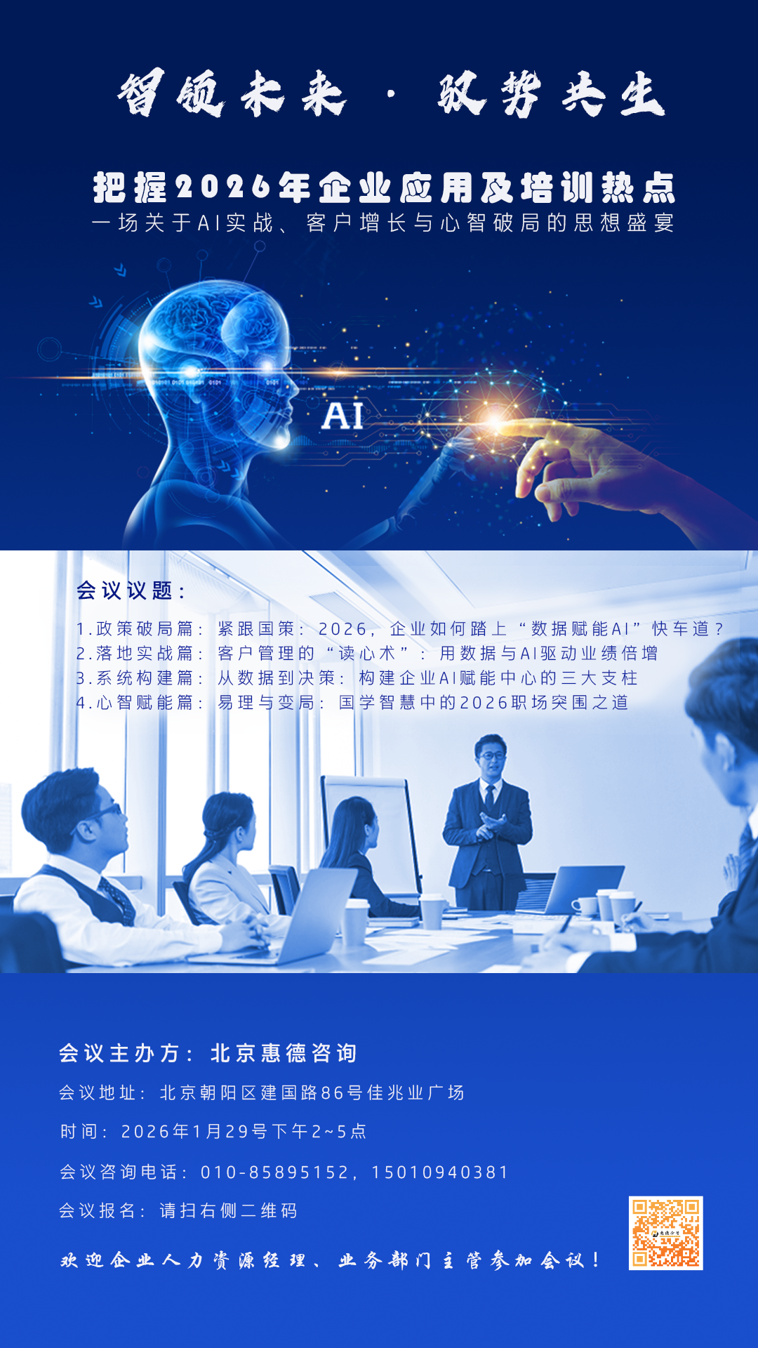 您好!1月29日下午惠德企管将在北京举办2026年度企业应用与培训热点《用数据给AI赋能、AI给企业赋能》专业主题沙龙活动,诚邀您及贵司相关人员参加,受邀惠德会员客户免费参加。