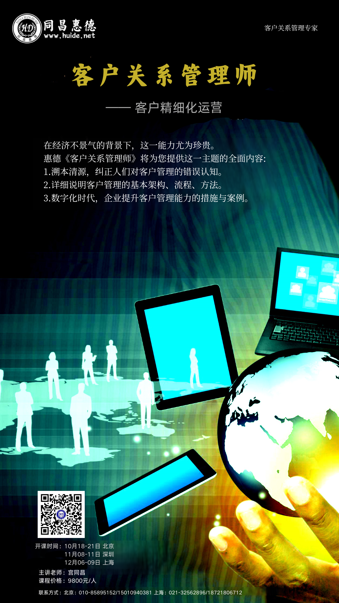 在数智化时代,客户关系管理(CRM)变得更加重要。随着数据量的不断增加和技术的不断发展,企业可以更好地了解和分析客户的需求和行为,并在客户生命周期的各个阶段提供更加个性化、精准的服务。2025年11月8-11日由北京惠德培训主办、首席讲师宫同昌老师主讲的《客户关系管理师》培训认证高级研修班即将在深圳开课,欢迎大家咨询报名。