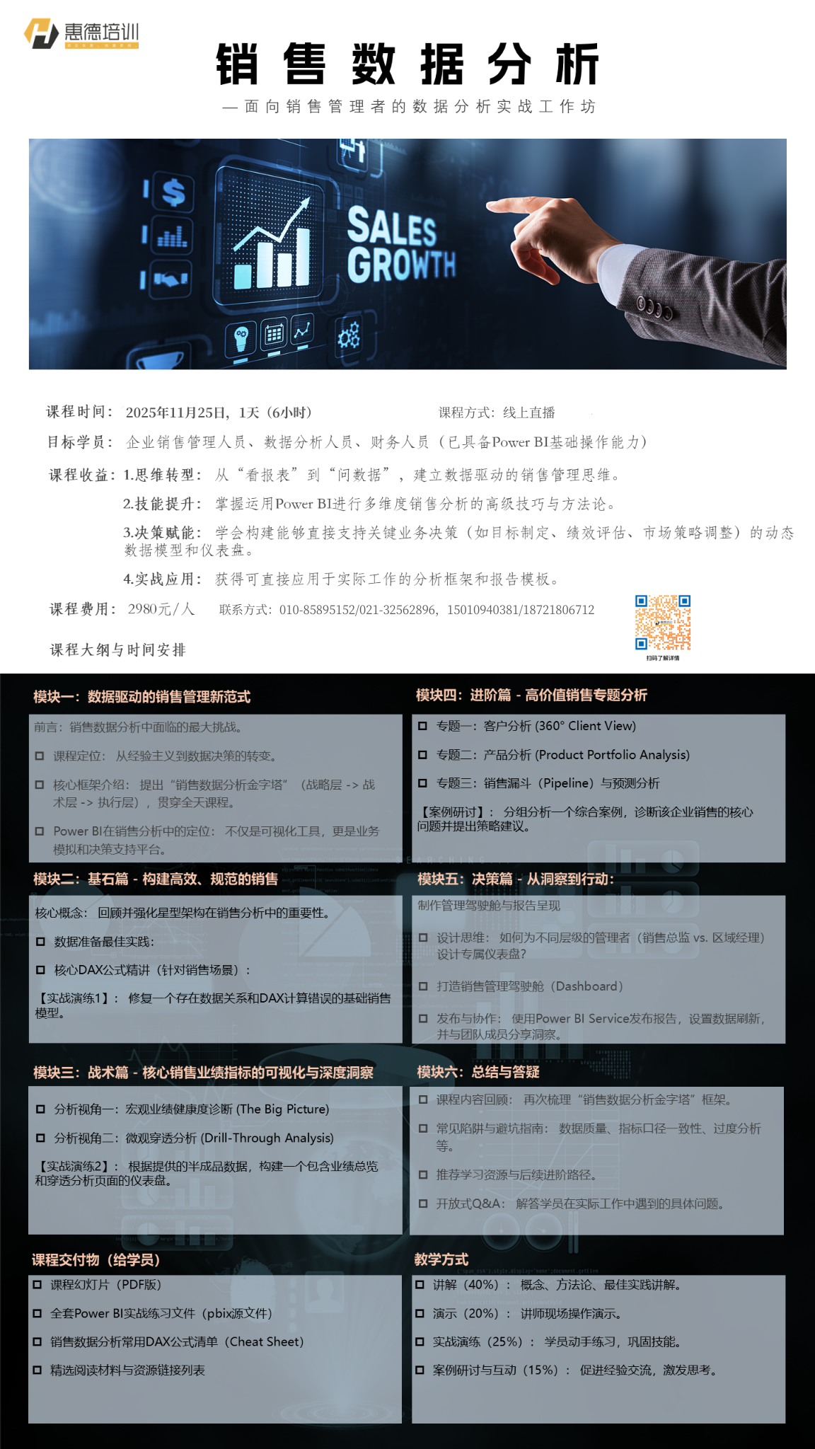 参训对象:企业销售管理人员、数据分析人员、财务人员(已具备Power BI基础操作能力