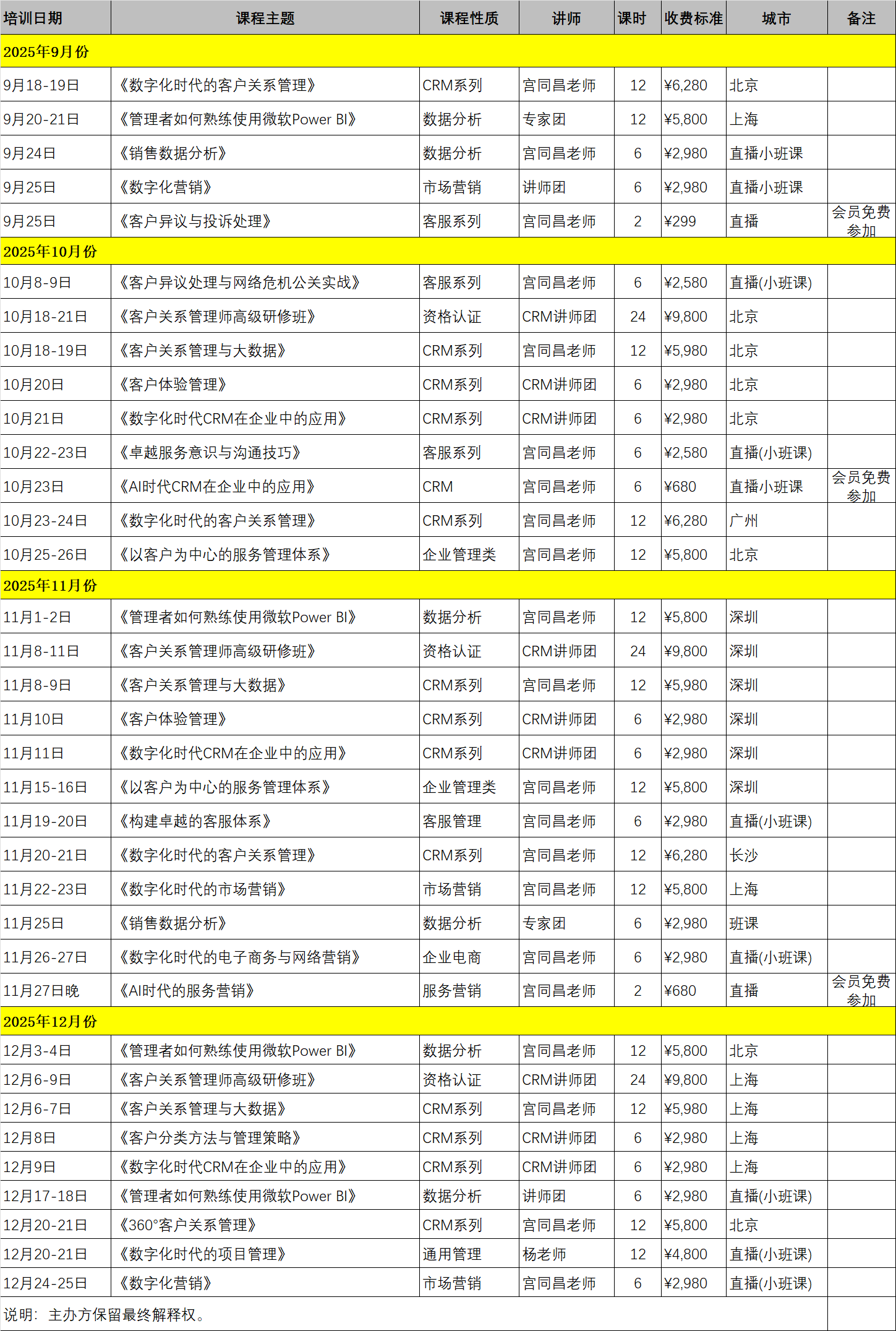 1、《客户关系管理与大数据》 (宫同昌老师) 10月18-19日上海/11月8-9日深圳/12月6-7日上海