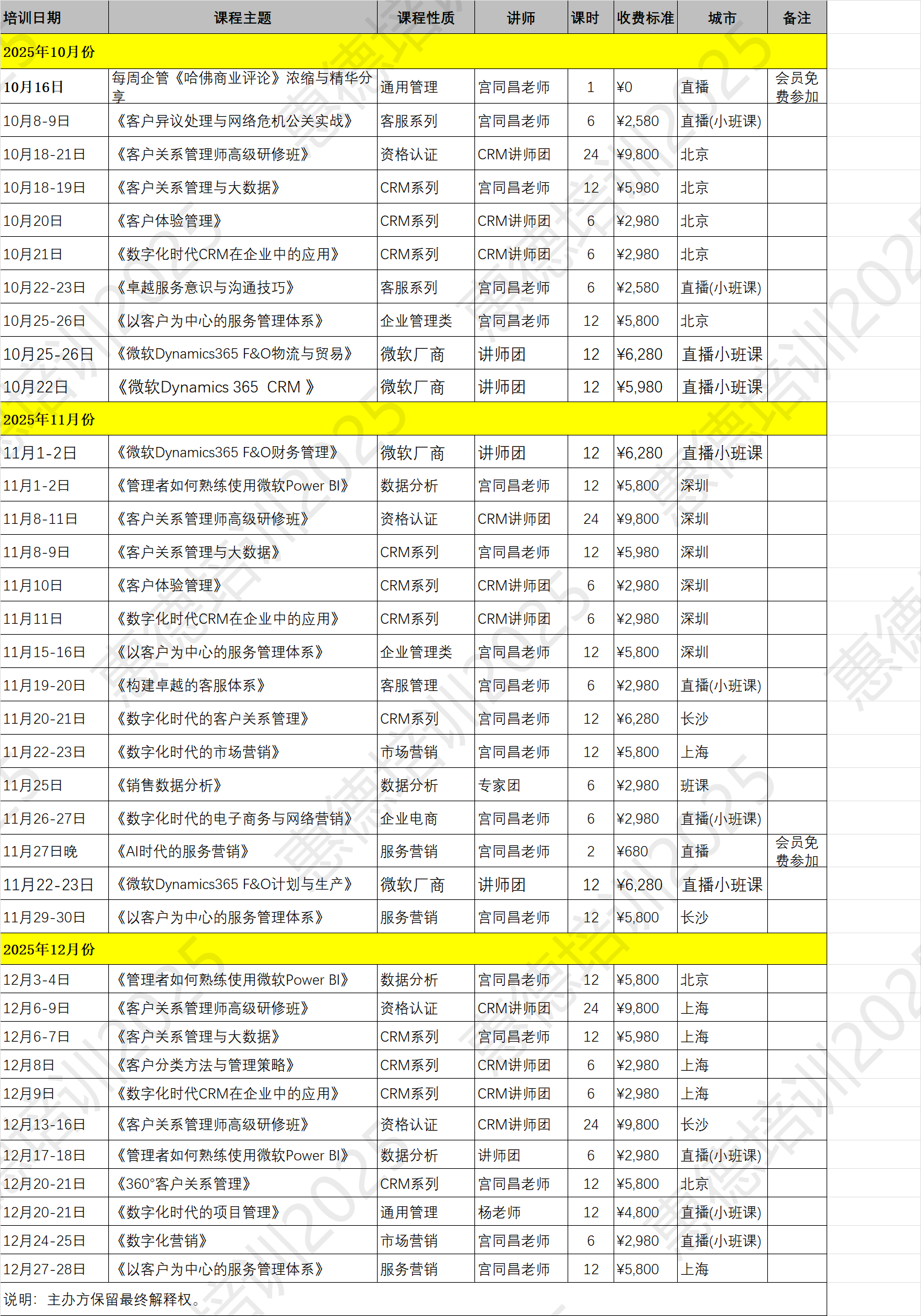 10-12份惠德培训企业管理培训公开课排期已经更新,欢迎各企业朋友前来关注。