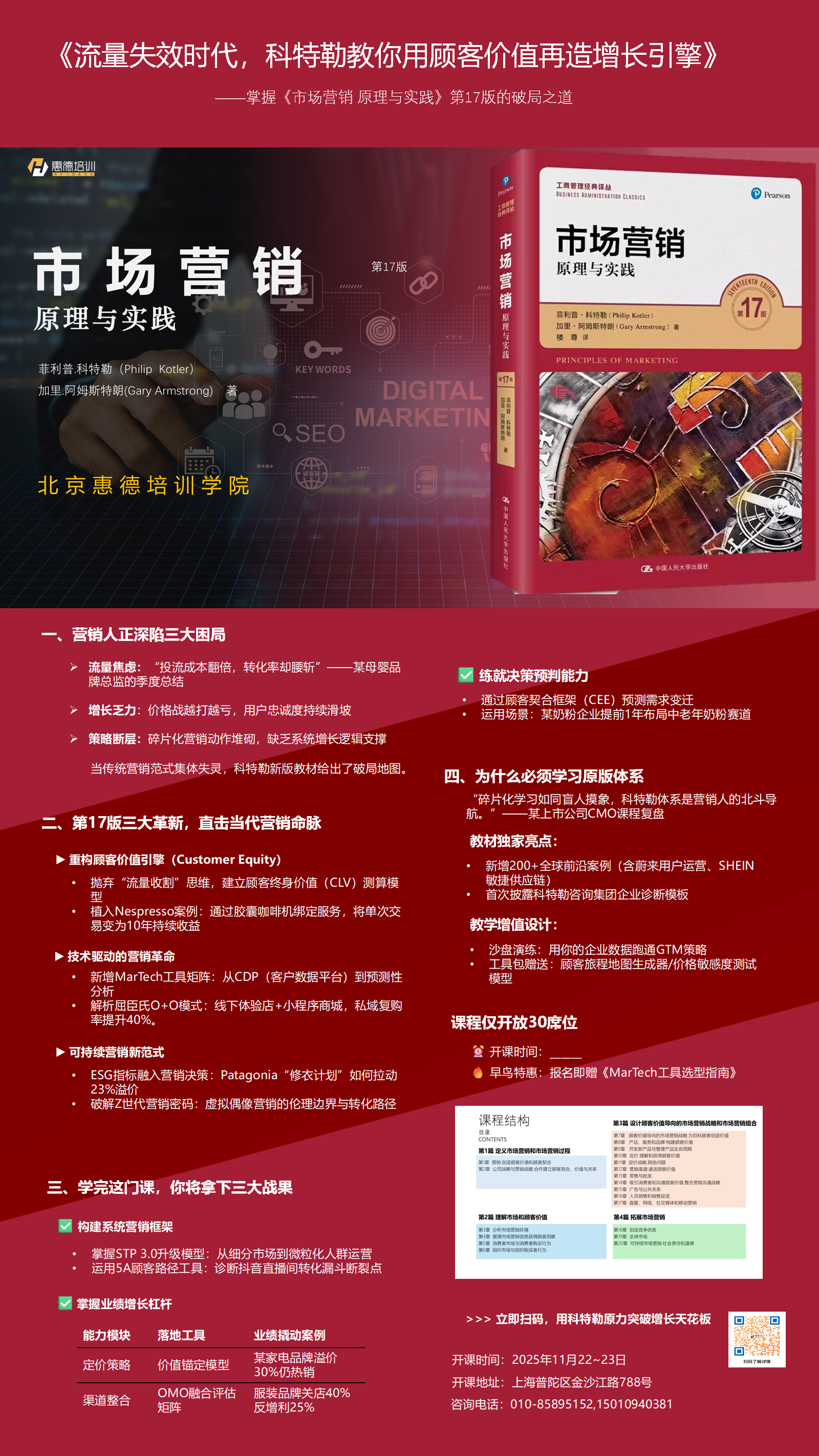 11月22-23日由上海惠德培训主办、惠德首席专家宫同昌老师主讲的《数字化时代的市场营销》将为您深度讲解科特勒原著第17版本。